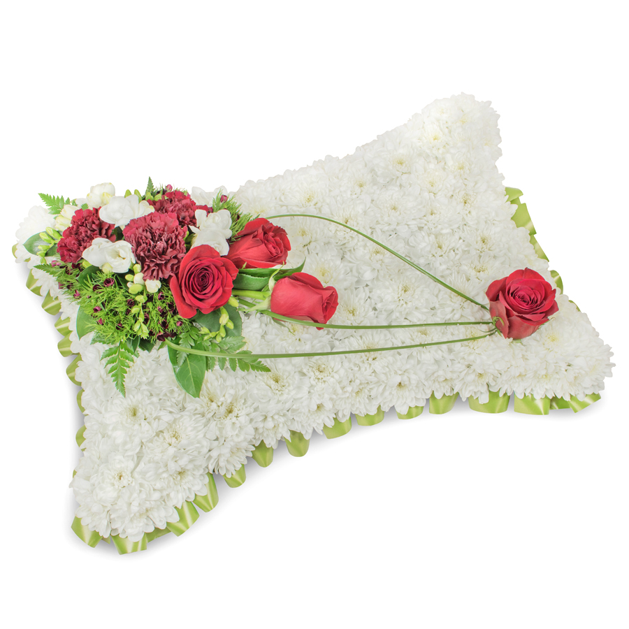 This uniquely designed bouquet is the perfect way to express sympathy. With a charming mix of white chrysanthemums, red roses, white freesias, dark red carnations, dianthus, and bear grass, every flower is carefully hand-picked to ensure lasting freshness and beauty.