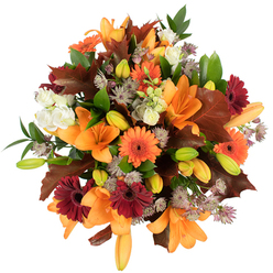 Invite the sunshine into your home with a radiant bouquet made of sunny yellow roses, green and yellow chrysanthemums, orange gerberas, white and purple lisianthus and red hypericum. A floral combination in the brightest seasonal colours that will warm the heart of someone deeply cherished!